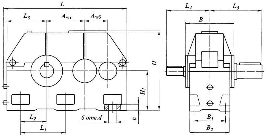 | Редуктор | Awt | Awb | В | B1 | B2 | Н | H1 | h | L | L1 | L2 | L3 | L4 | L5 | d |