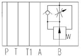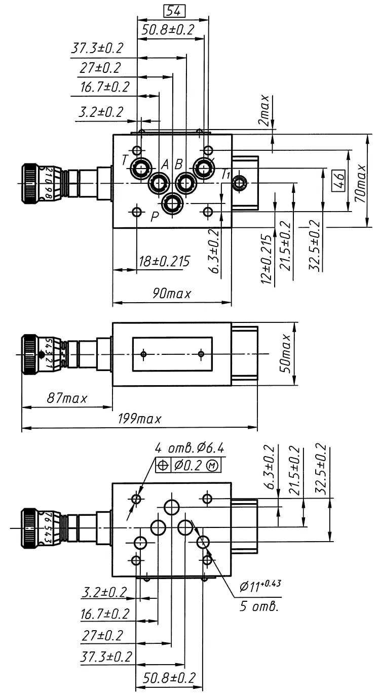 | Р - напорная гидролиния; А и В - гидролинии, идущие к другим гидроустройствам (цилиндровые гидролинии); T и Т 1 - сливные гидролинии. | |