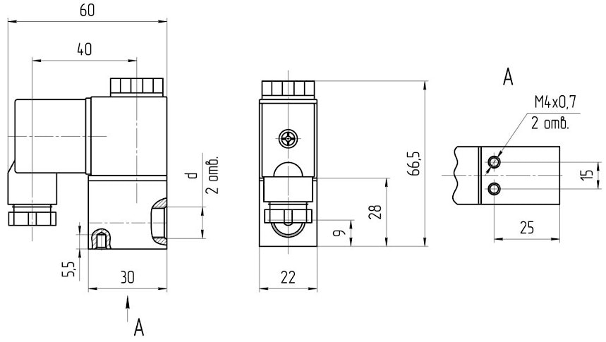 Распределители 2-х линейные двухпозиционные с условным проходом (Ду) 2 мм и 3-х линейный двухпозиционный с условным проходом (Ду) 1,2 мм, с электромагнитным управлением и пружинным возвратом имеют: