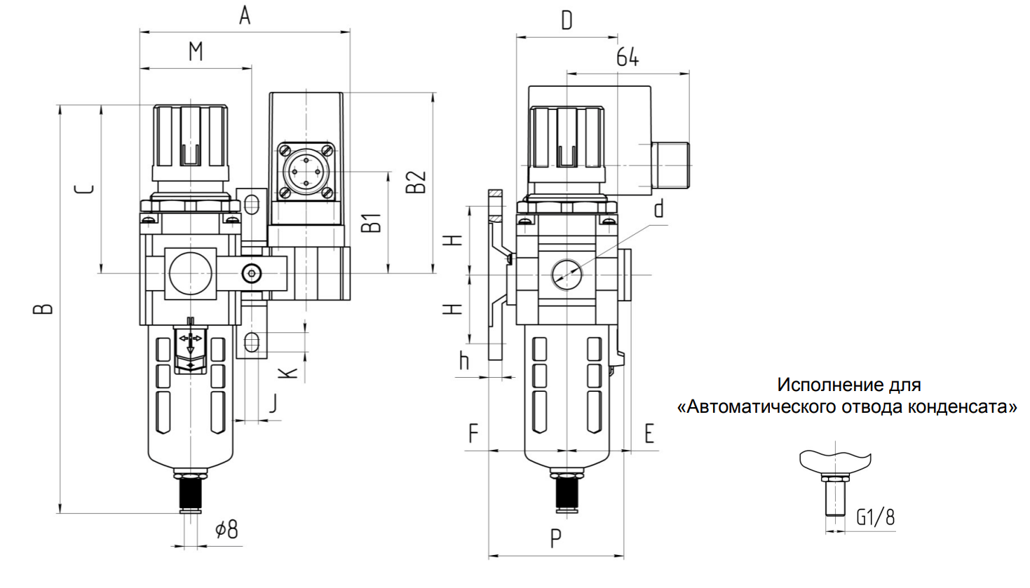 По отдельному заказу возможно изготовление блока с автоматическим отводом конденсата (-АО) и абсолютной тонкостью фильтрации 5 мкм (-5).