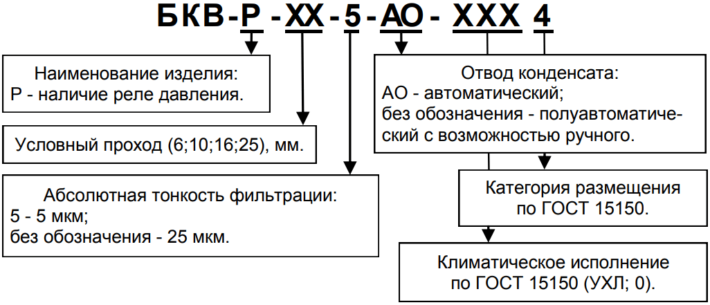 Пример записи при заказе блока кондиционирования со встроенным манометром, с реле давления, с условным проходом 10 мм, присоединительной резьбой G 3/8", климатического исполнения УХЛ, категории размещения 4: БЛОК КОНДИЦИОНИРОВАНИЯ БКВ-Р-10 УХЛ 4