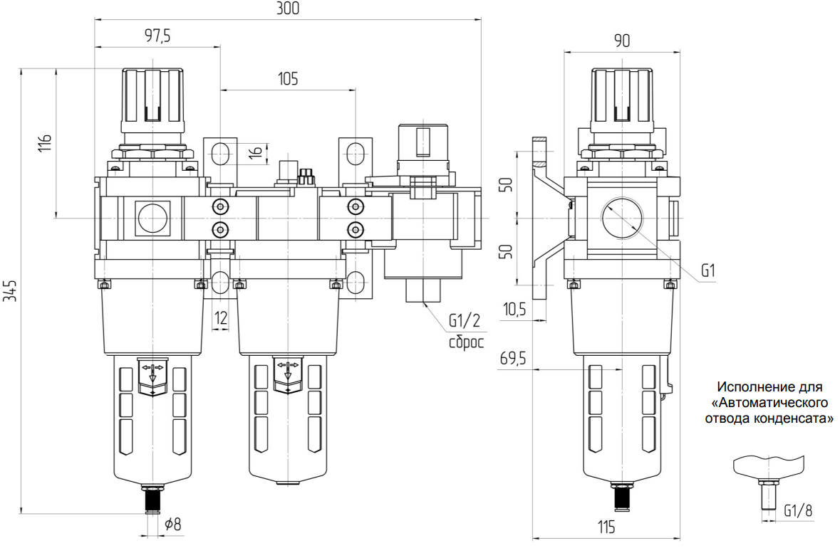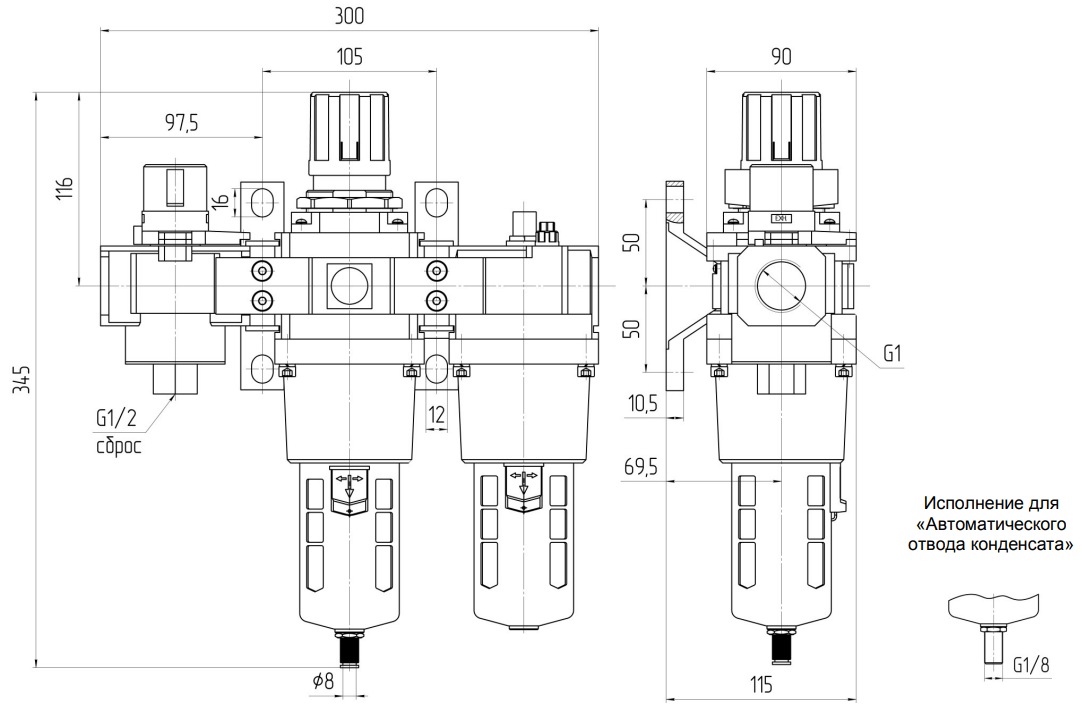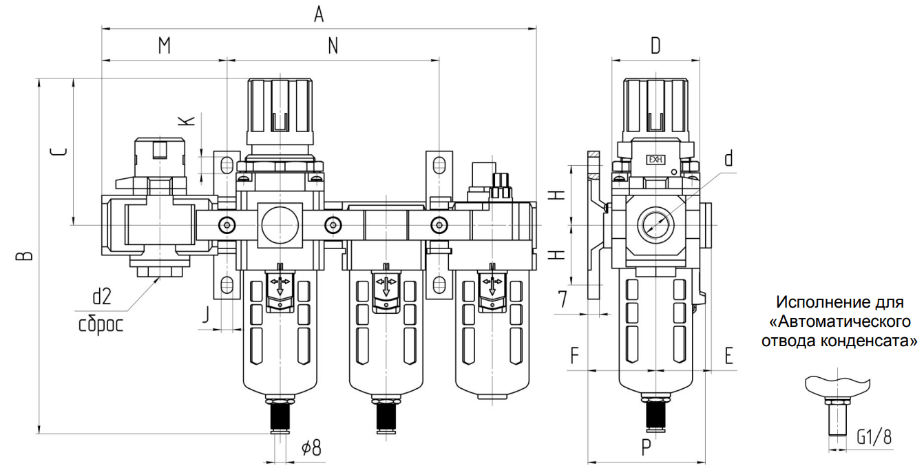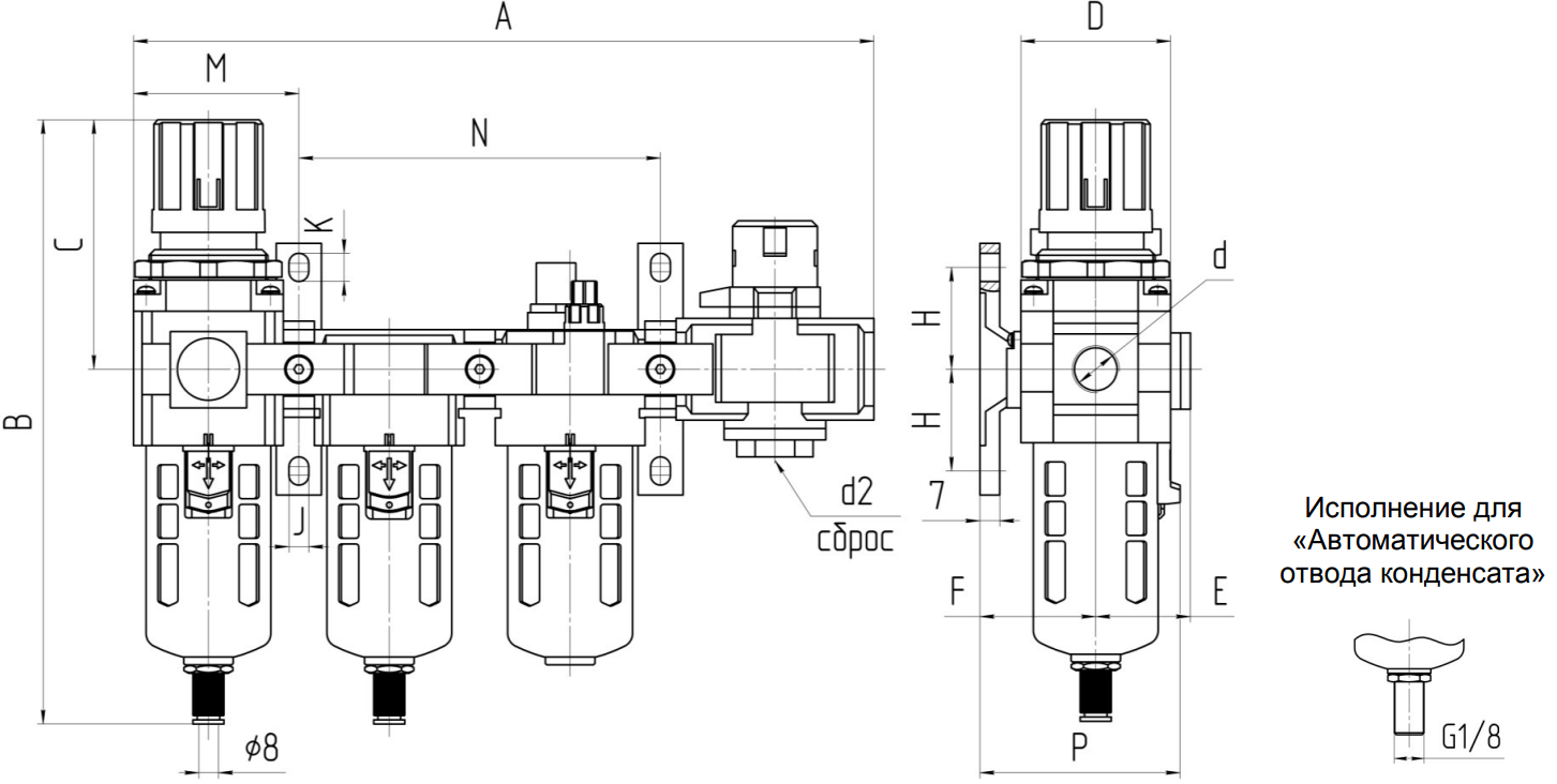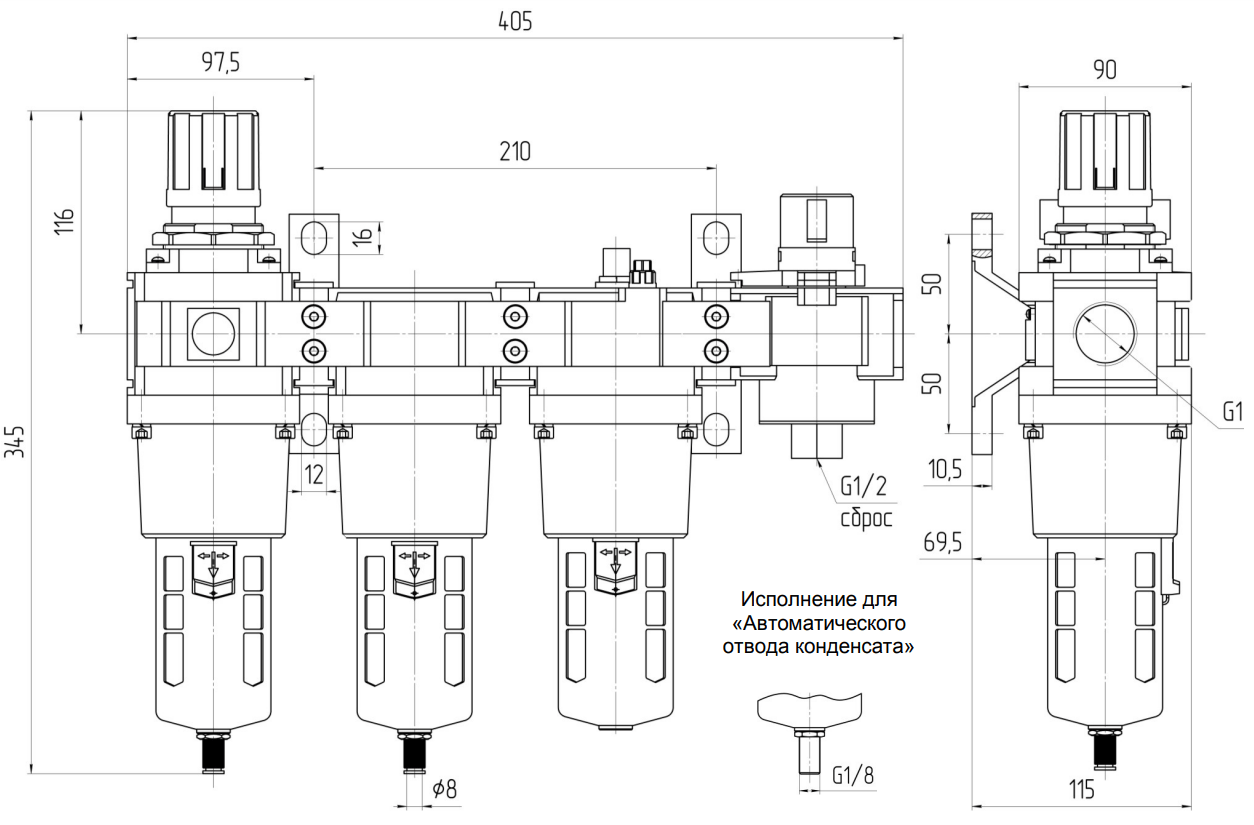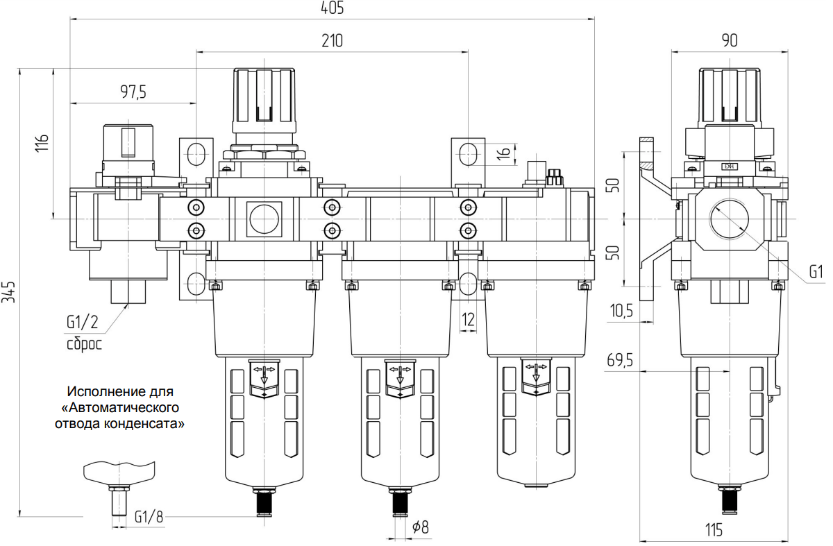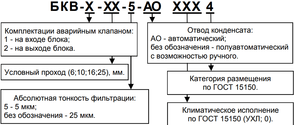 По отдельному заказу возможно изготовление блоков с автоматическим отводом конденсата (-АО) и абсолютной тонкостью фильтрации 5 мкм (-5).