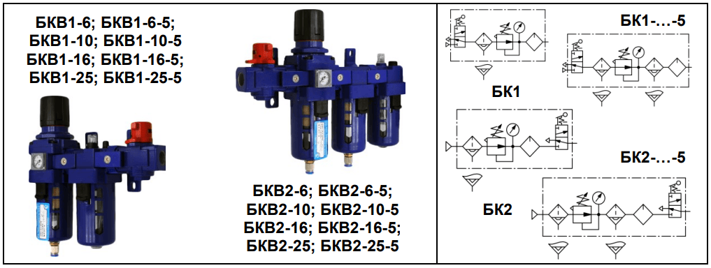 Состоит из блока подготовки воздуха типа П-ФРКВ, маслораспылителя типа П-М и аварийного клапана типа БК-16-100 с проставкой между ними для установки крепежного кронштейна.