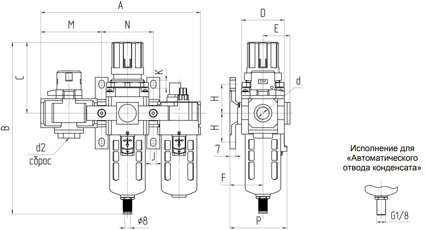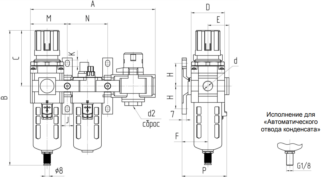 В нижней части стакана блока подготовки воздуха расположено полуавтоматическое устройство для сброса конденсата, открываемое в ручную или автоматически при отсутствии давления.