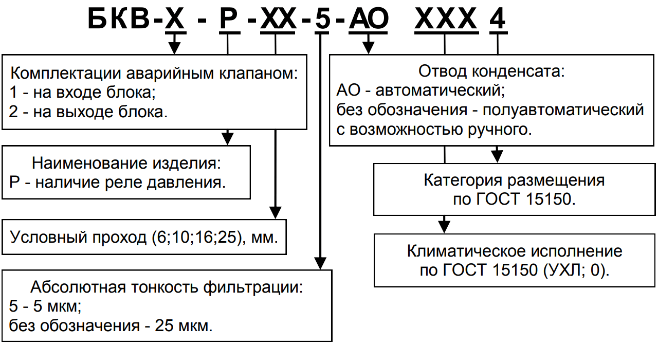 Пример записи при заказе блока кондиционирования со встроенным манометром, с реле давления, аварийным клапаном на входе, условным проходом 10 мм, присоединительной резьбой G 3/8", климатического исполнения УХЛ, категории размещения 4: БЛОК КОНДИЦИОНИРОВАНИЯ БКВ1-Р-10 УХЛ 4