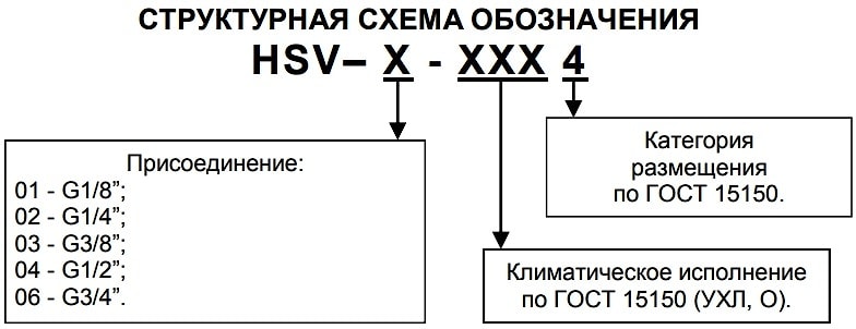 Пример записи при заказе распределителя с присоединением G1/4, ручным управлением, климатического исполнения УХЛ, категория размещения 4: ПНЕВМОРАСПРЕДЕЛИТЕЛЬ HSV - 02 УХЛ4